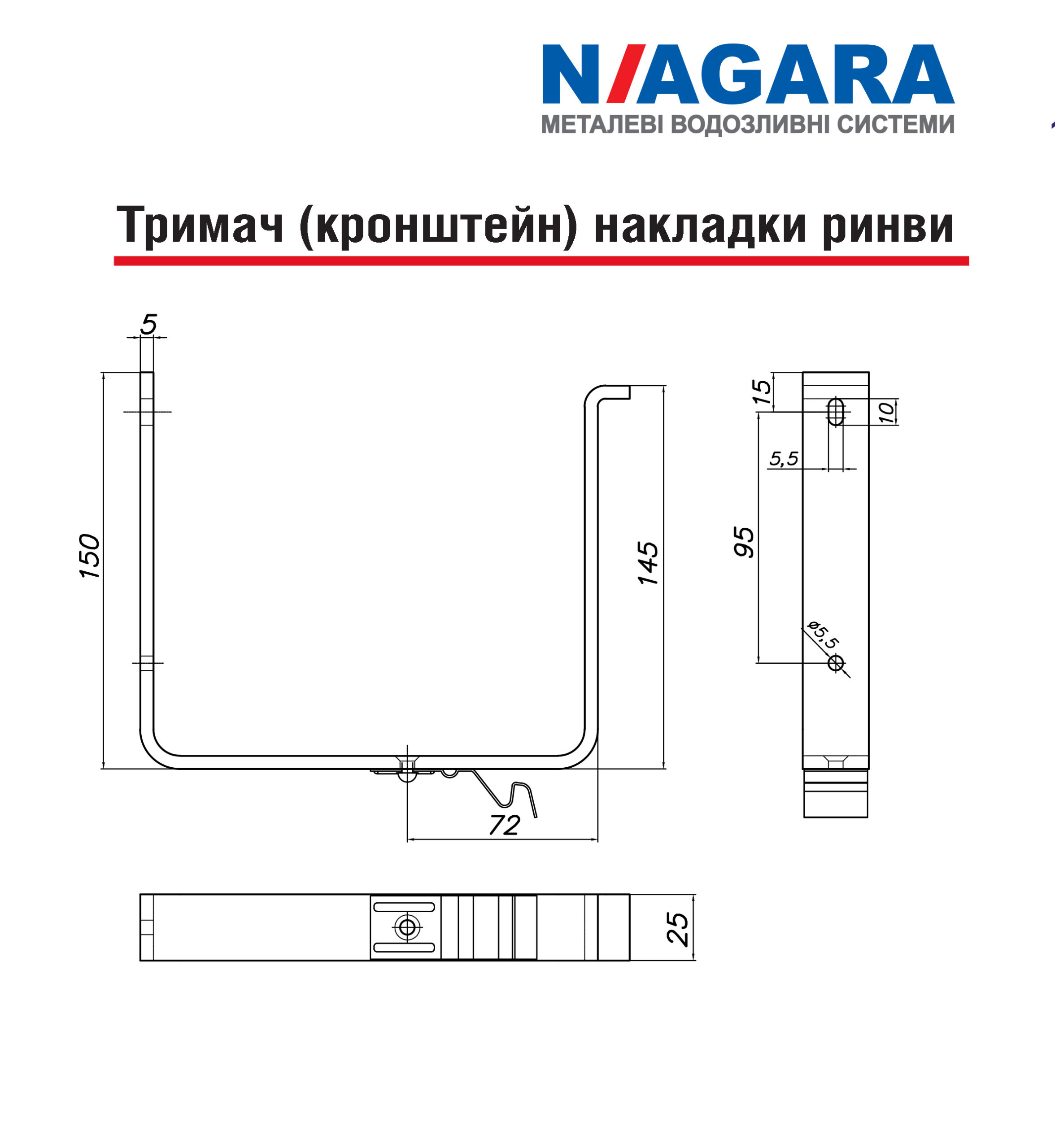 Тримач (кронштейн) використовується для кріплення декоративної накладки до фасаду. Рекомендована установка – разом з гаком комбі плюс для монтажу ринви. Тримач (кронштейн) виготовлений з високоякісної сталі та покритий порошковою фарбою того ж кольору, що й інші елементи водостоку, що дозволяє йому ефектно зливатися з усією системою.